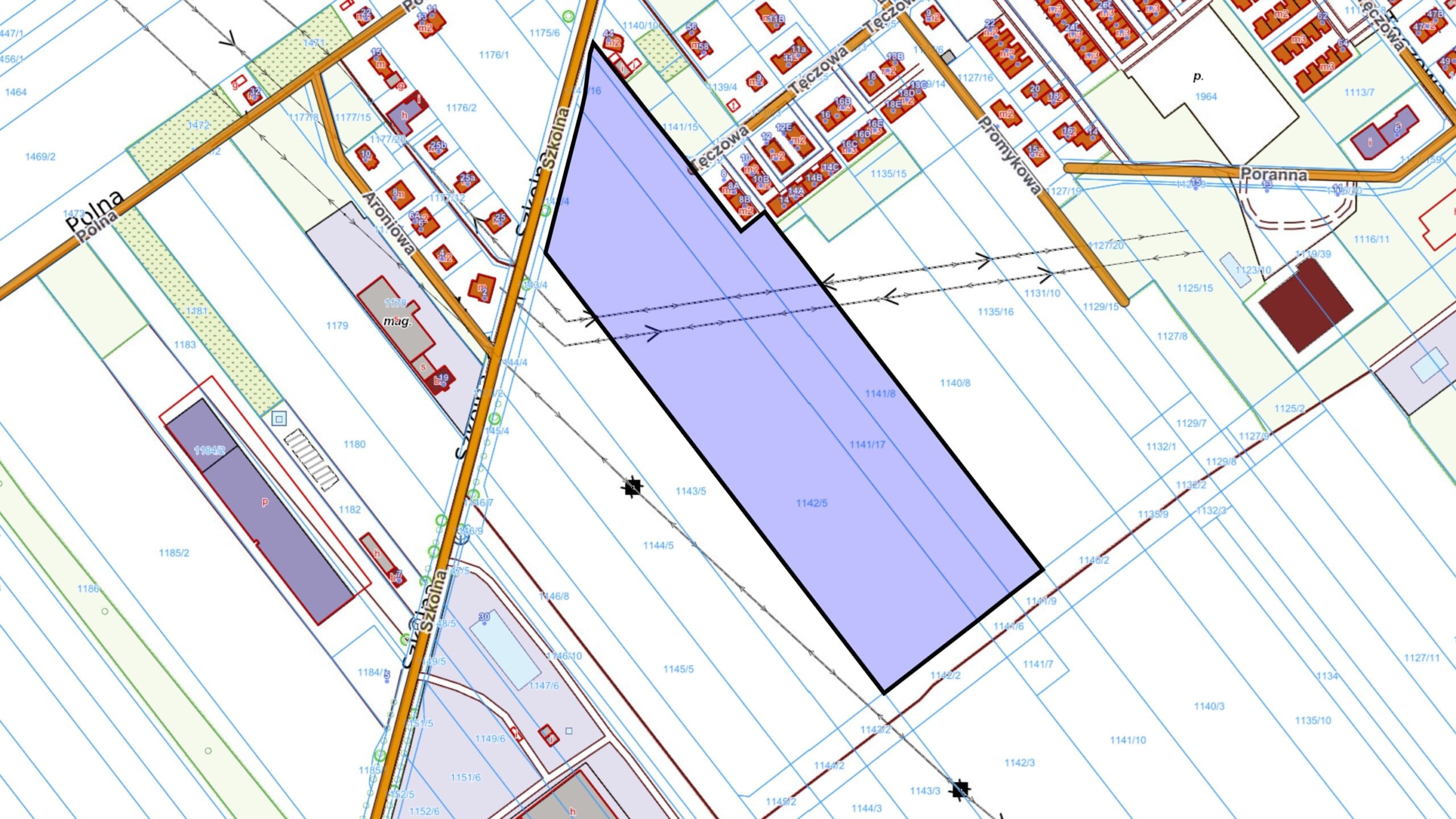 Lokalizacja i dojazd: Nieruchomość ma zapewniony dojazd od ulicy Szkolnej, który w przyszłości zostanie usprawniony poprzez budowę asfaltowej drogi, co jest przewidziane w planach jednego z funduszy inwestycyjnych działających w sąsiedztwie. Fundusz ten, współpracujący przy sąsiadującej inwestycji, podpisał porozumienie z gminą na realizację tej drogi, której wykonanie planowane jest w przeciągu około roku.