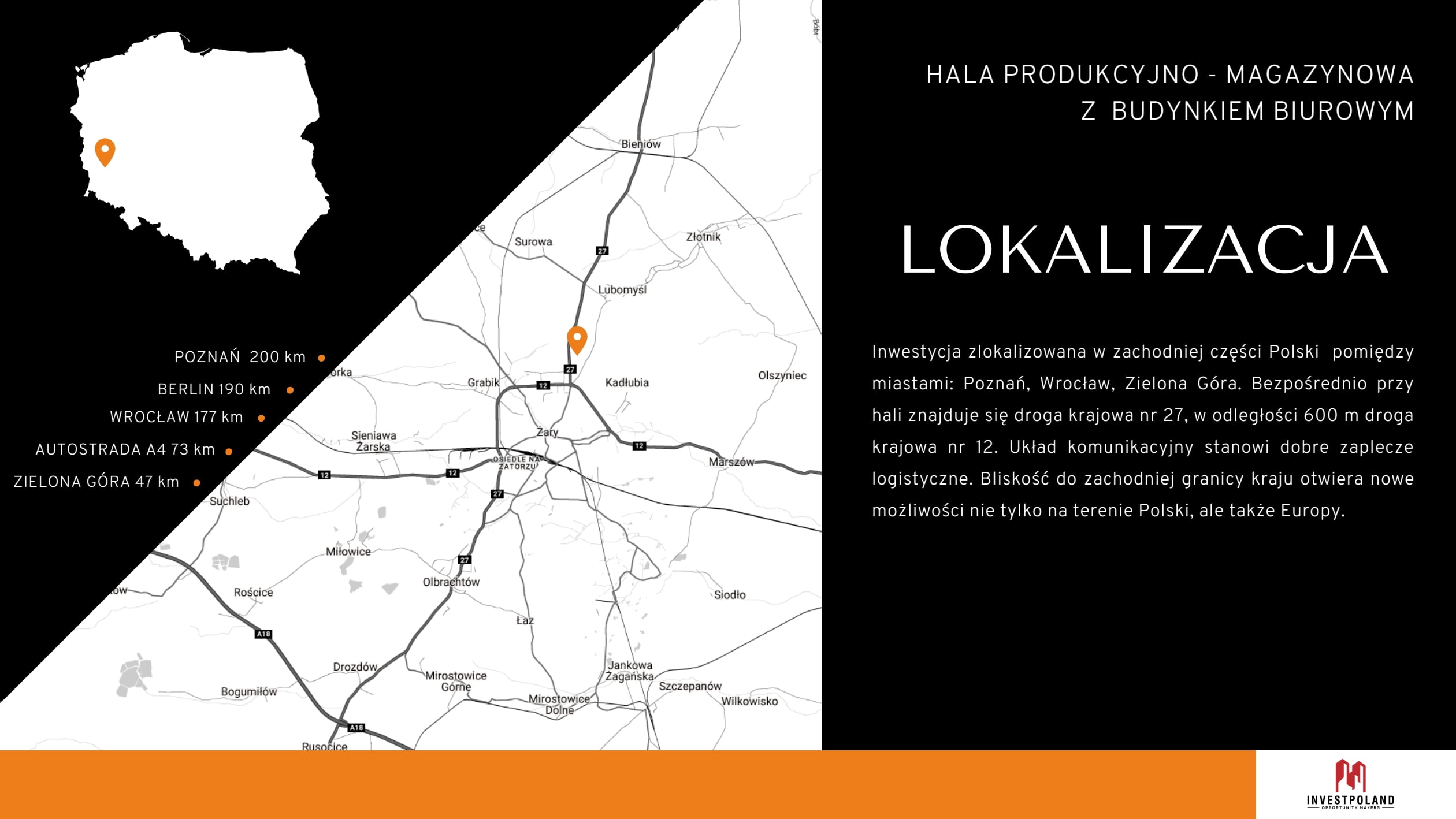 Inwestycja zlokalizowana w zachodniej części Polski pomiędzy miastami: Poznań, Wrocław, Zielona Góra. Bezpośrednio przy hali znajduje się droga krajowa nr 27, w odległości 600 m droga krajowa nr 12. Układ komunikacyjny stanowi dobre zaplecze logistyczne. Bliskość do zachodniej granicy kraju otwiera nowe możliwości nie tylko na terenie Polski, ale także Europy.